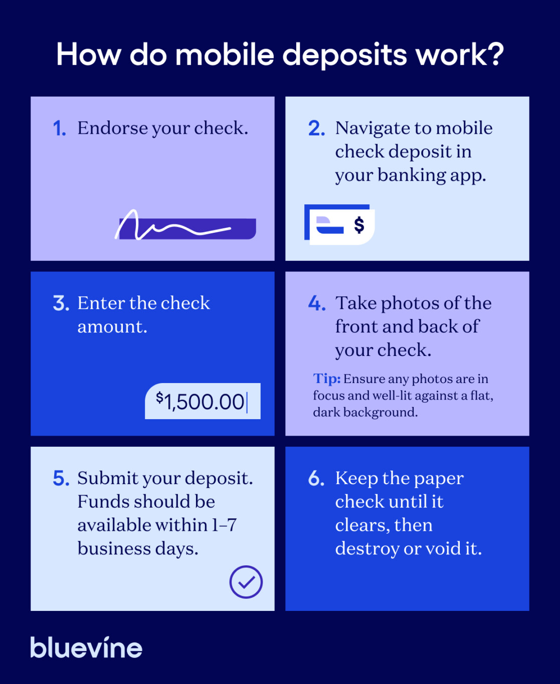 Most mobile check deposit processes tend to follow the same steps: