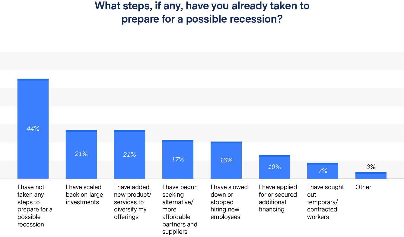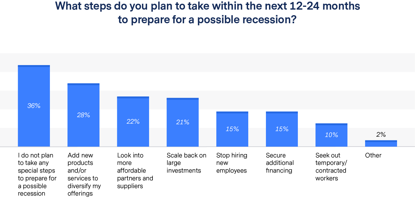 Among the survey’s key findings are that while 80 percent of small business owners worry about a possible recession, 44 percent have not yet taken any steps to prepare and 36 percent do not plan to take any special steps to prepare within the next 12-24 months.