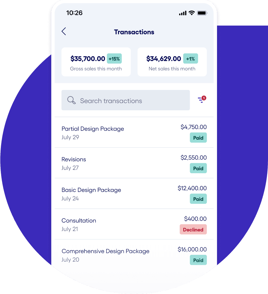 Track incoming payments, past invoices, and Stripe payouts all in your Bluevine dashboard. Filter by payment status to get a real-time view with transaction details, so you know what’s been paid and what’s still pending.
