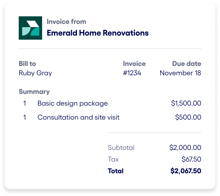 Once you enable payment processing and connect your Stripe account, you can easily include a payment link on your invoice so customers can pay via credit card and other convenient payment methods. You’ll also be able to track payments and automatically reconcile paid invoices.